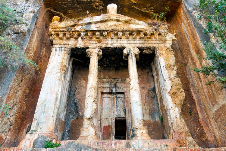 Fethiye’s story stretches back to Telmessos, the city’s ancient name. Carved directly into the cliff face above the town are the Lycian rock tombs, including the iconic Tomb of Amyntas—its columns glowing gold at sunset. Below, the modern marina is filled with sailboats, fishermen, and gulets preparing for their daily or multi-day voyages.